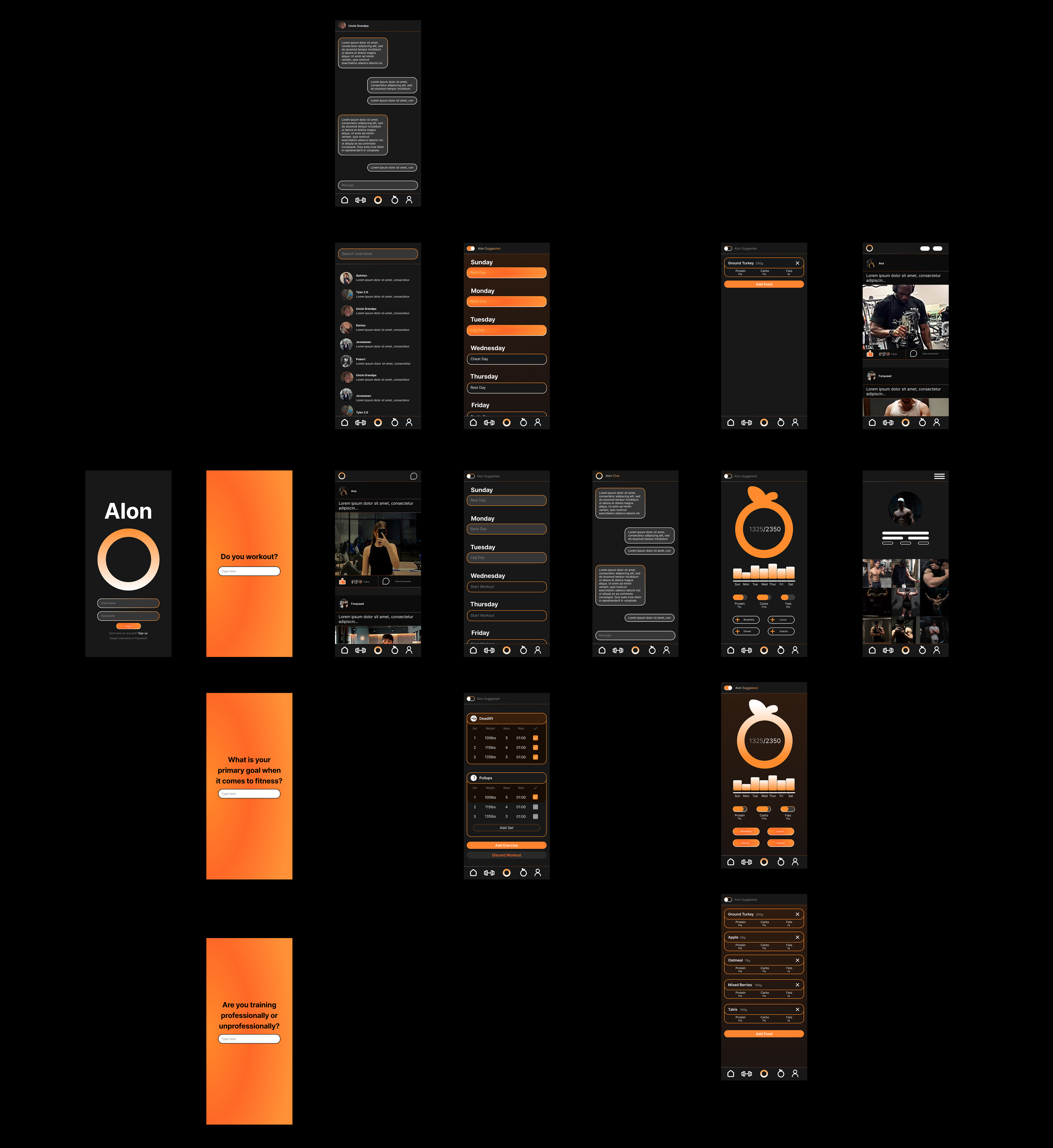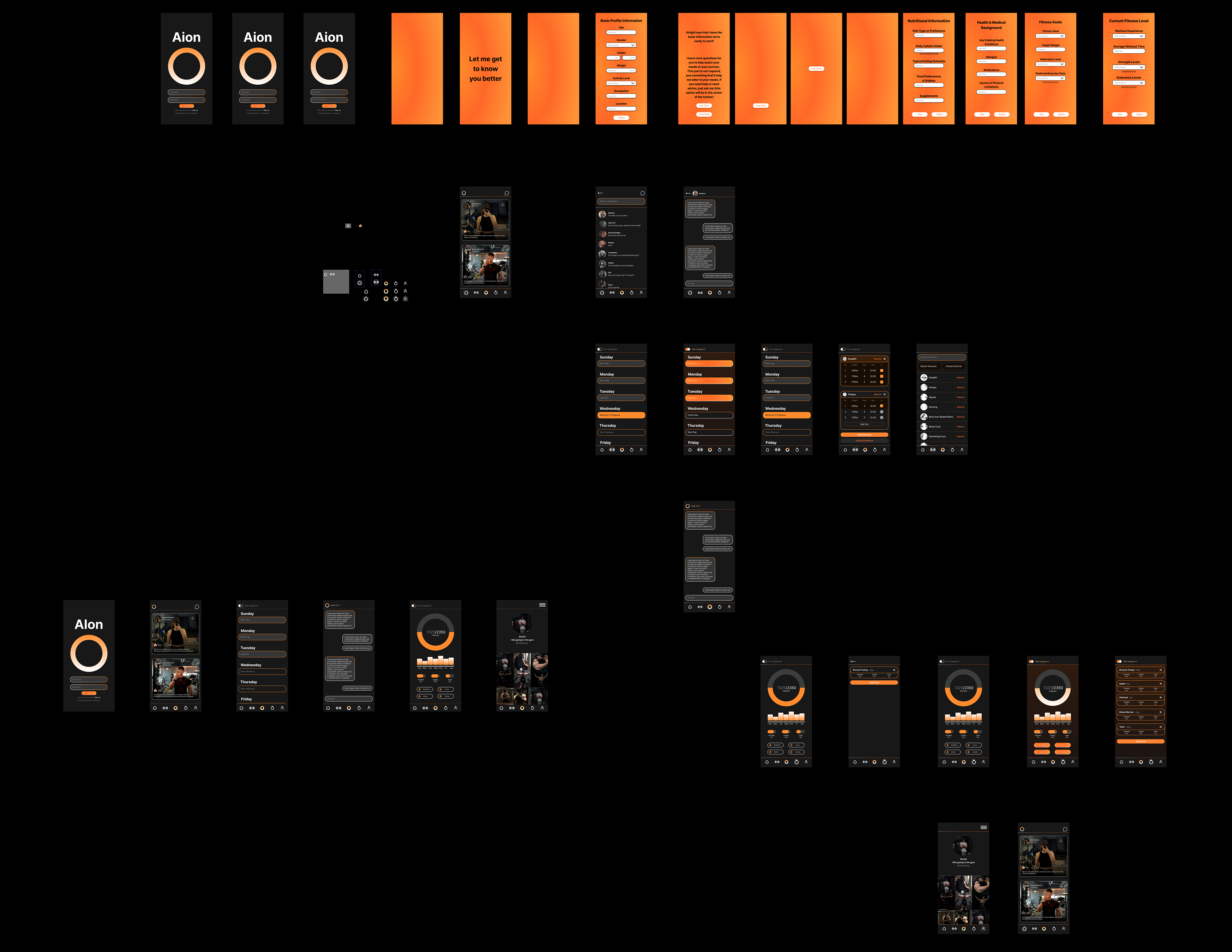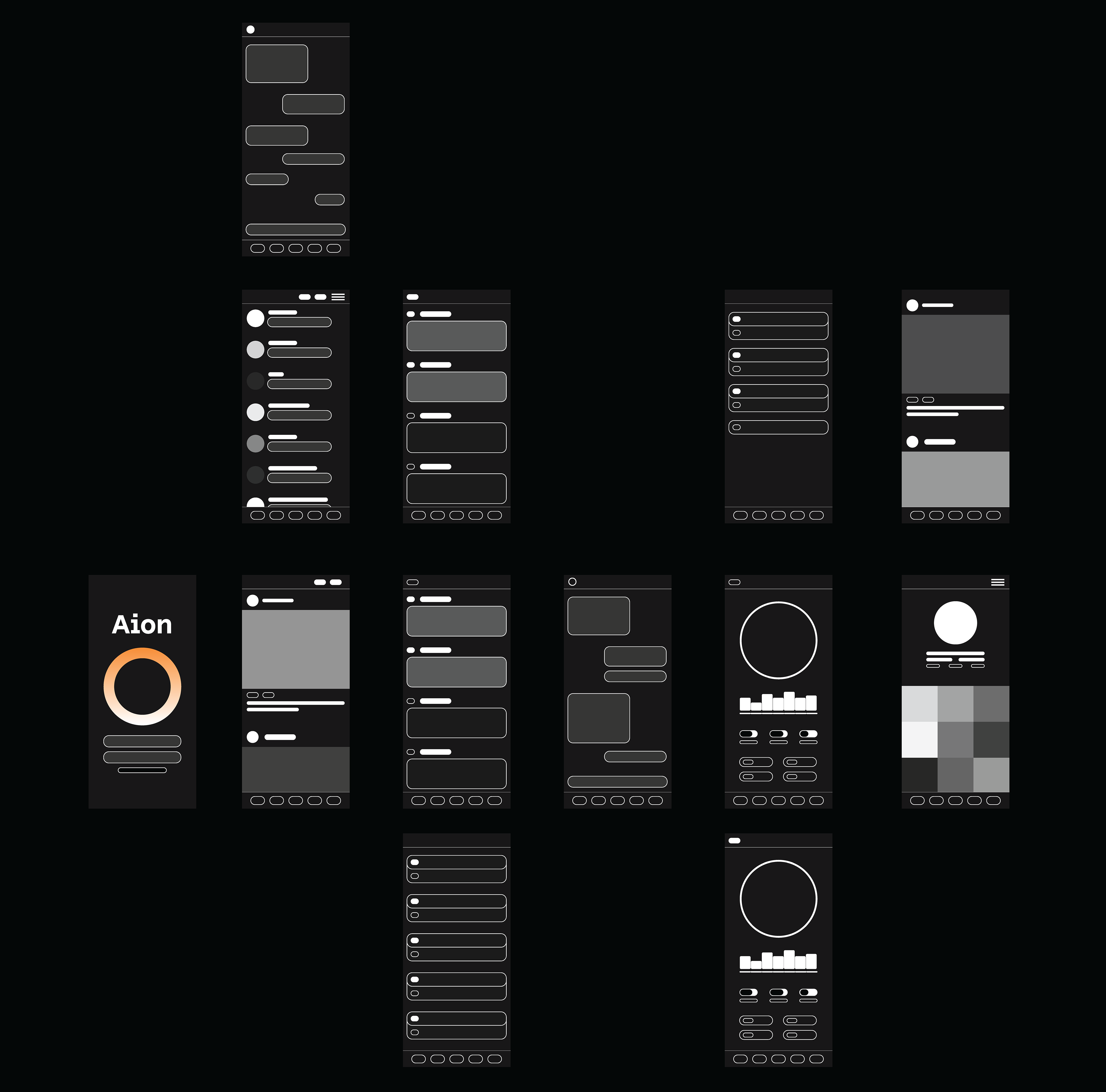 The first high-fidelity pass introduced Aion’s dark UI theme, orange gradients, icon system, and core visual style. These screens tested hierarchy, spacing, and overall readability.