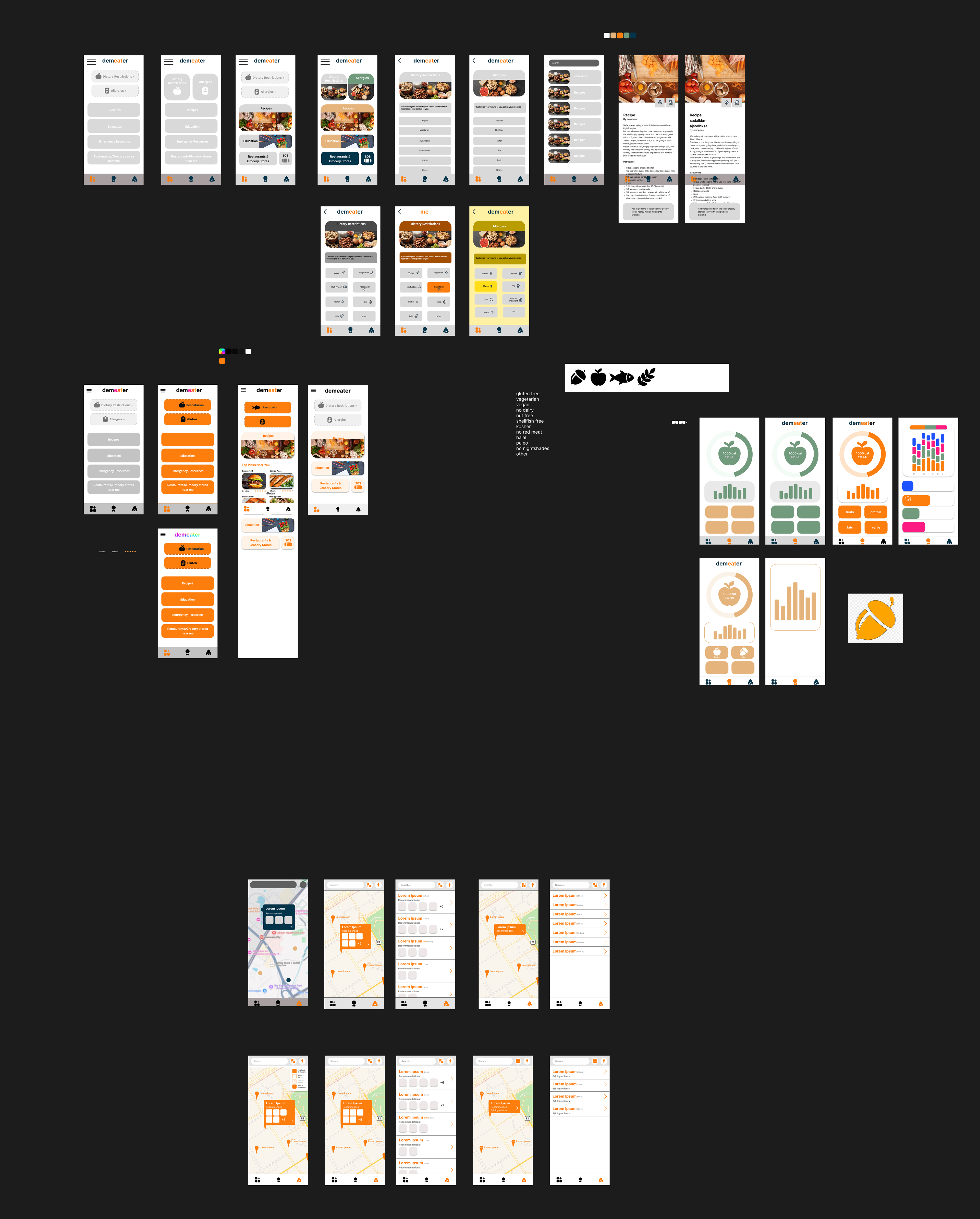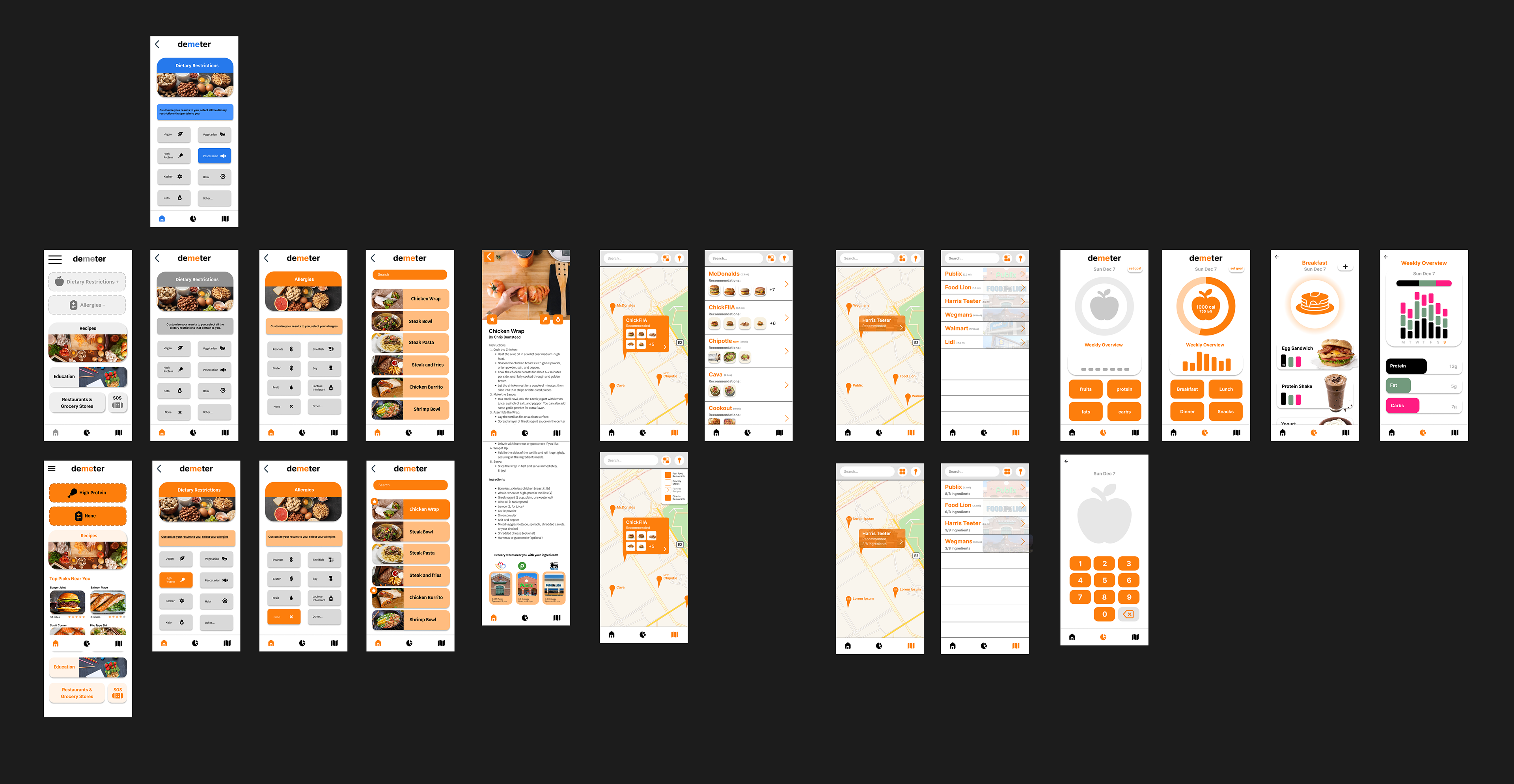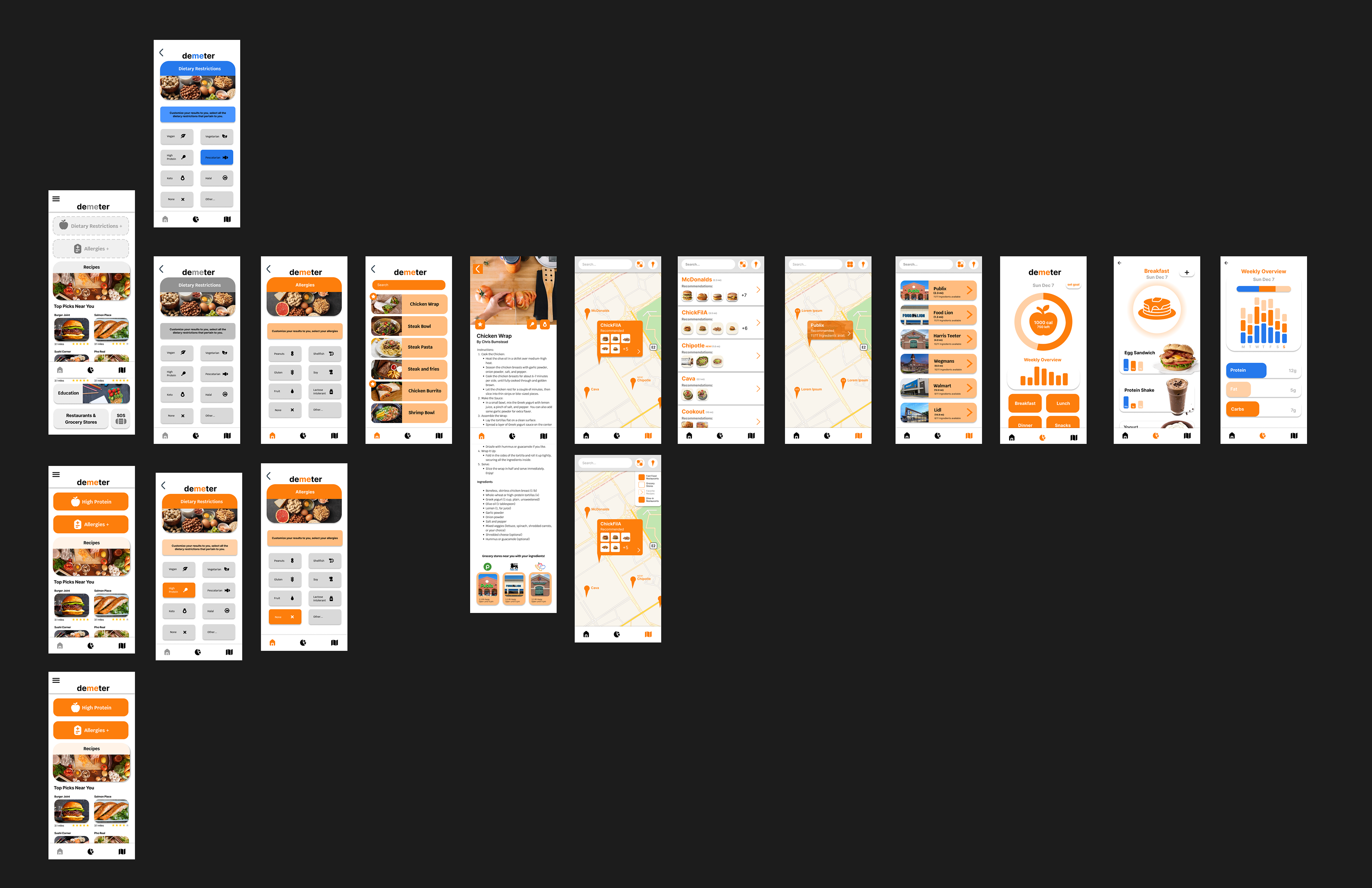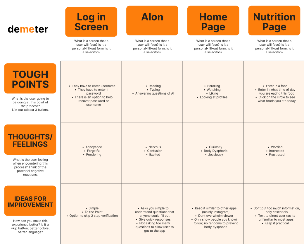Demeter’s visual direction balanced warmth and clarity using bright orange accents, clean typography, and organized layouts. The process included sketches, low-fidelity wireframes, a simple design system, and fully refined high-fidelity screens.