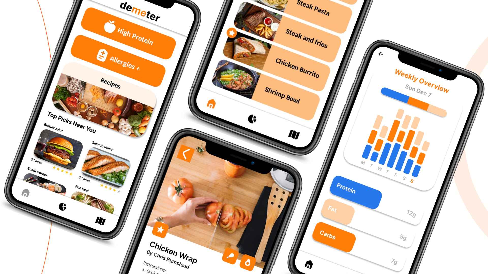 Demeter is a food-ordering and nutrition app designed to help busy students make healthier choices quickly. The goal was to simplify meal planning with clear navigation, accessible nutritional info, and a clean, student-friendly interface.